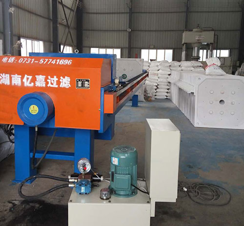 液壓壓緊機械壓緊時,由液壓站供高壓油,油缸與活塞構(gòu)成的元件腔充滿油液,當(dāng)壓力大于壓緊板運 行的摩擦阻力時,壓緊板緩慢地壓緊濾板,當(dāng)壓緊力達到溢流閥設(shè)定的壓力值(由壓力表指針顯示)時,濾板、濾框(板框式壓濾機)或濾板(廂式壓濾機)被壓緊,溢流閥開始卸荷,這時,切斷電機電源,壓緊動作完成,退回時,換向閥換向,壓力油進入油缸的有桿腔,當(dāng)油壓能克服壓緊板的摩擦阻力時,壓緊板開始退回。